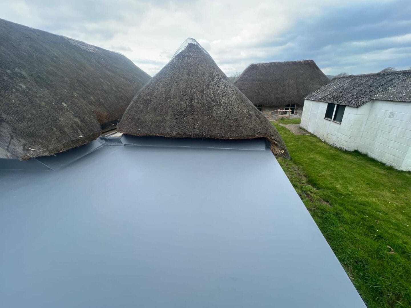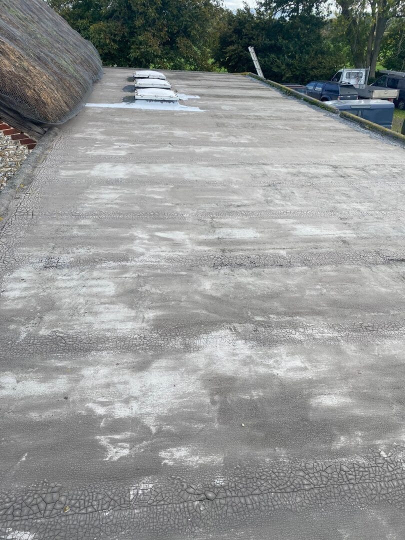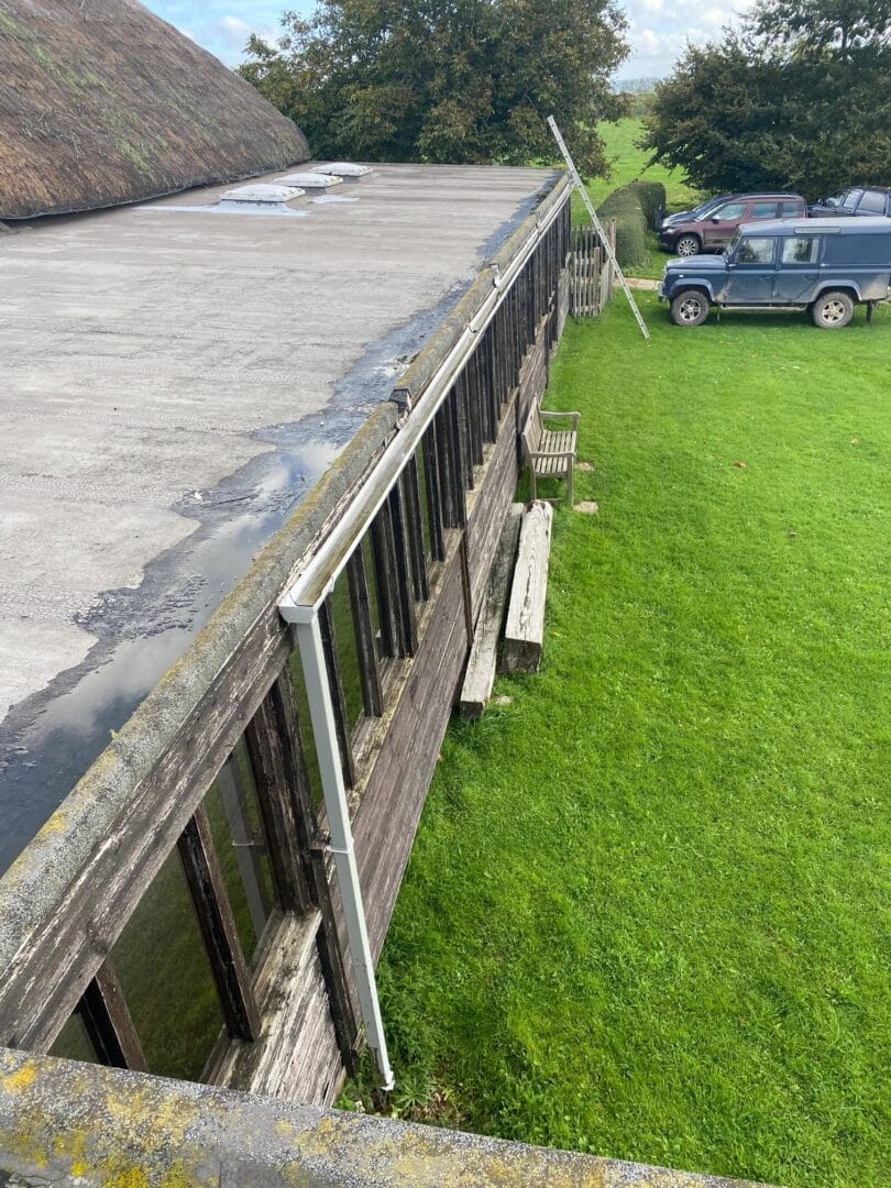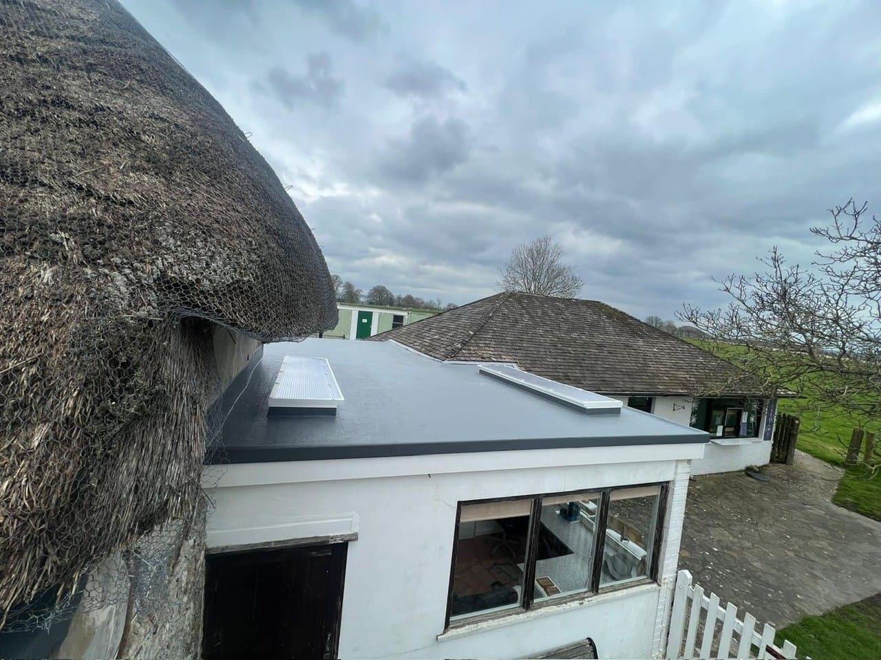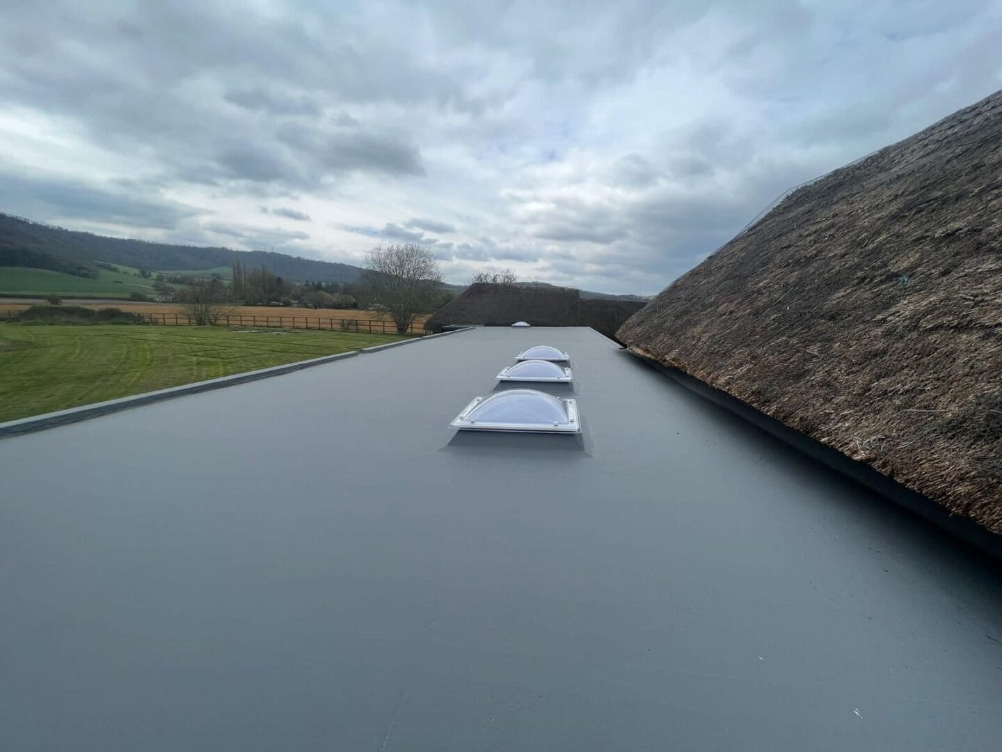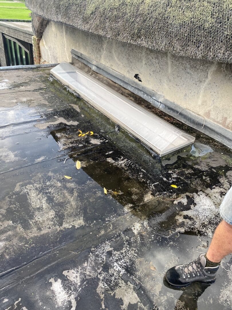 We were instructed by the client to replace the existing old and tired felt roofing system with a new modern system. This was a challenge as we had to ensure that the Roman Mosaic flooring was protected beneath the roof and there was no fire risk with the presence of the thatched roofing. We over come both these issues by using a protective light weight board to temporary cover over the Mosaic and for the roofing product we used Proteus waterproofing which is a cold applied Polyurethane roll on system incorporating a woven reinforcement sheets between coatings to give the system strength and flexibility, which is all cold applied thus omitting all fire risk. The roof lights were upgraded using Whitesales Polycarbonate domes and curbs. The existing timber decking was fully replaced with 18mm plywood.