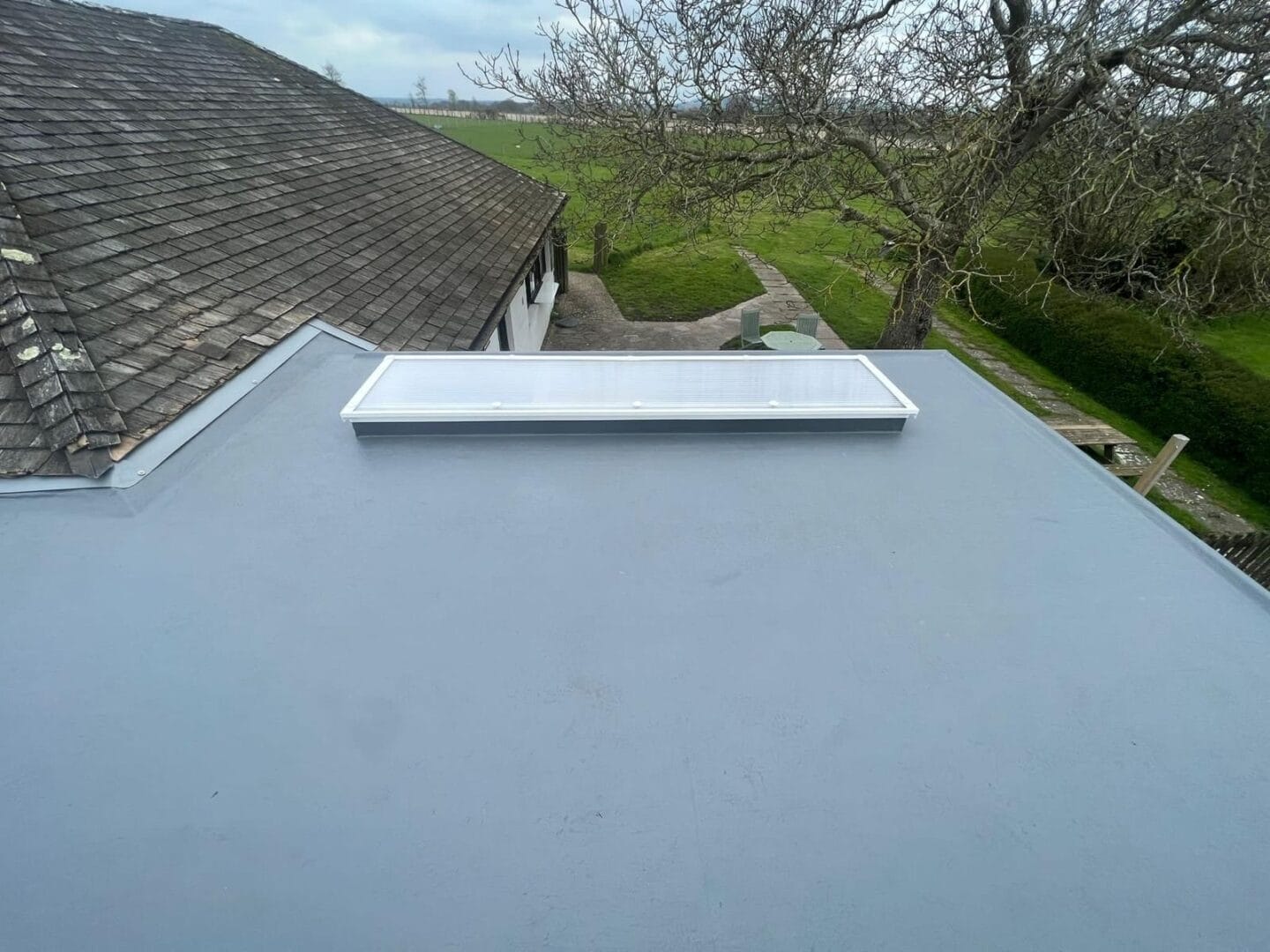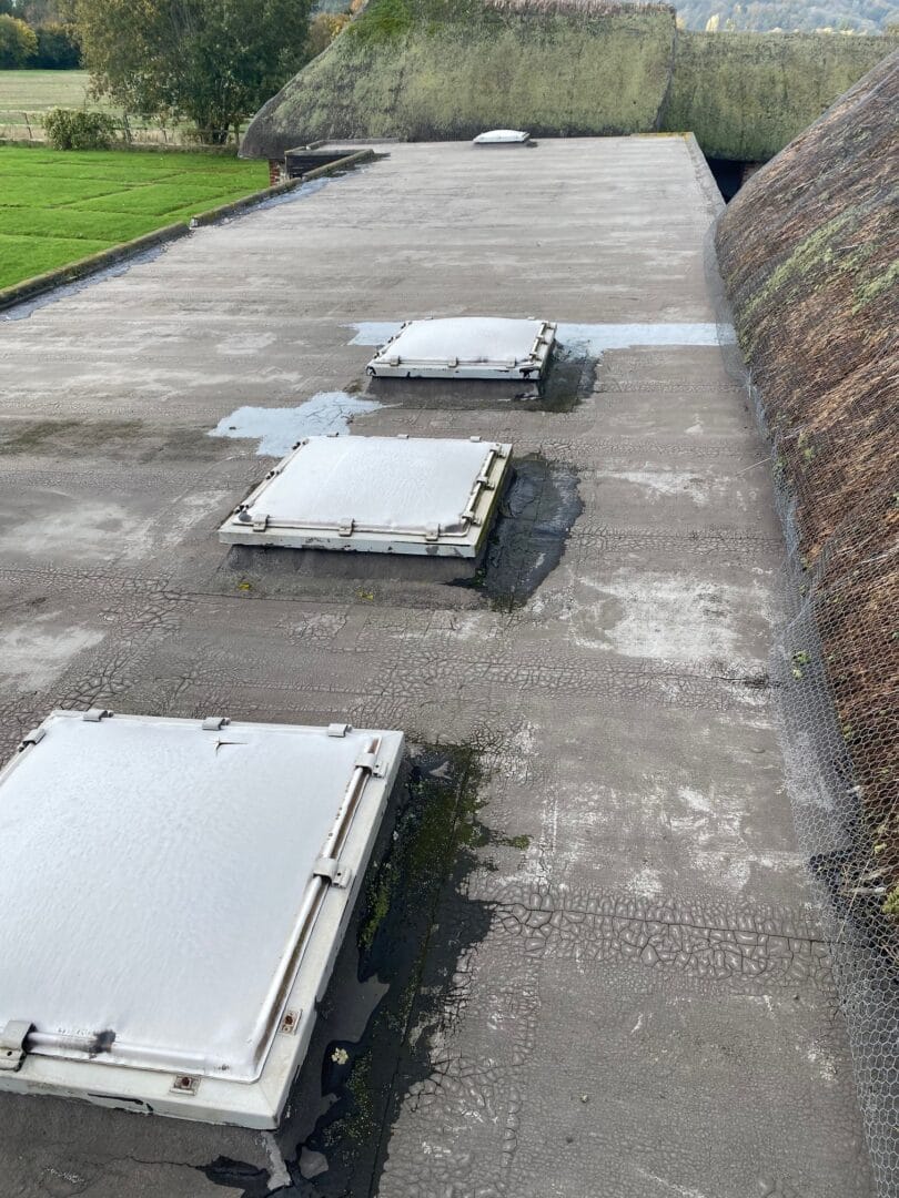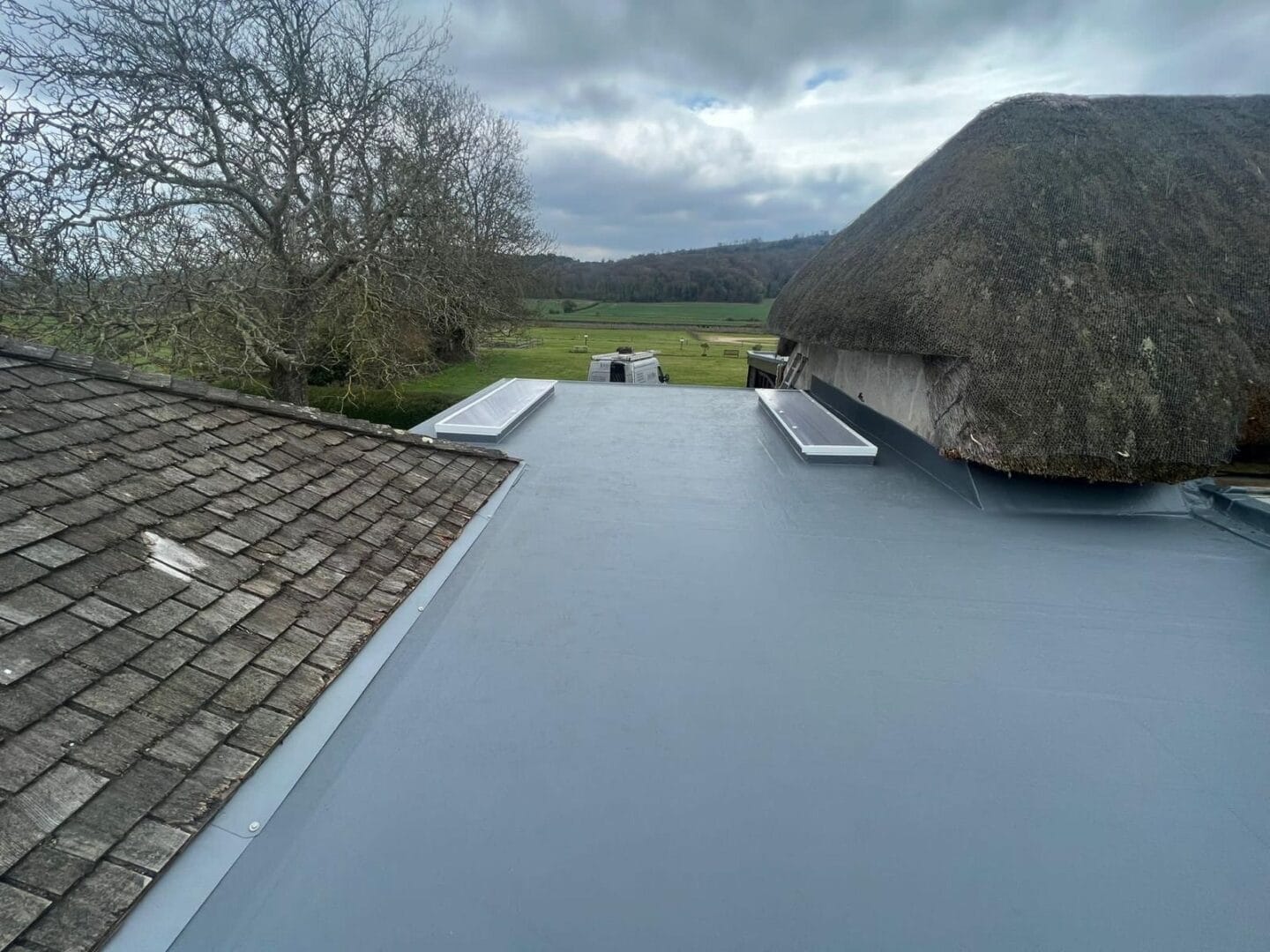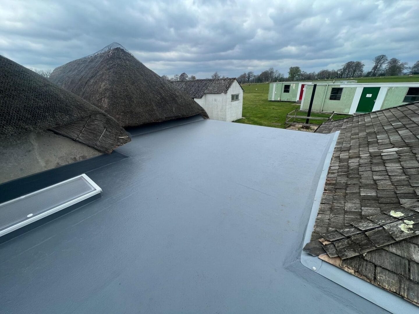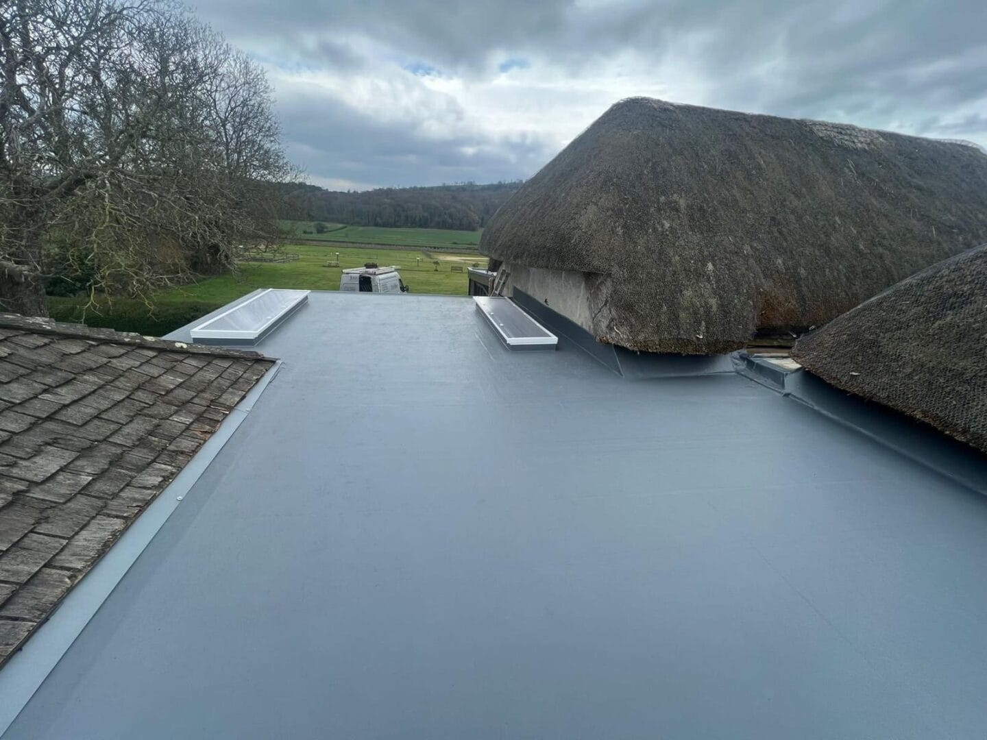 We were instructed by the client to replace the existing old and tired felt roofing system with a new modern system. This was a challenge as we had to ensure that the Roman Mosaic flooring was protected beneath the roof and there was no fire risk with the presence of the thatched roofing. We over come both these issues by using a protective light weight board to temporary cover over the Mosaic and for the roofing product we used Proteus waterproofing which is a cold applied Polyurethane roll on system incorporating a woven reinforcement sheets between coatings to give the system strength and flexibility, which is all cold applied thus omitting all fire risk. The roof lights were upgraded using Whitesales Polycarbonate domes and curbs. The existing timber decking was fully replaced with 18mm plywood.