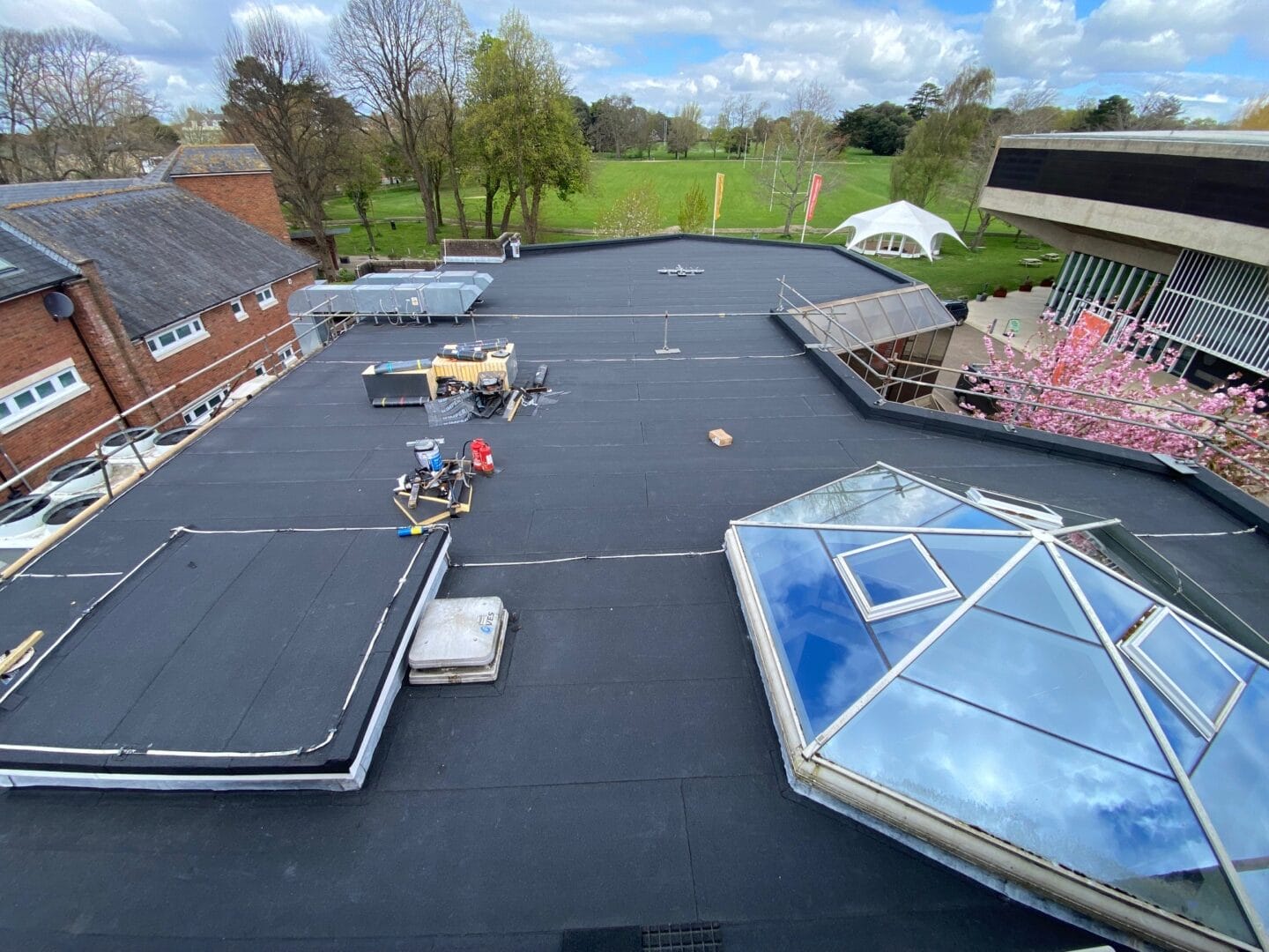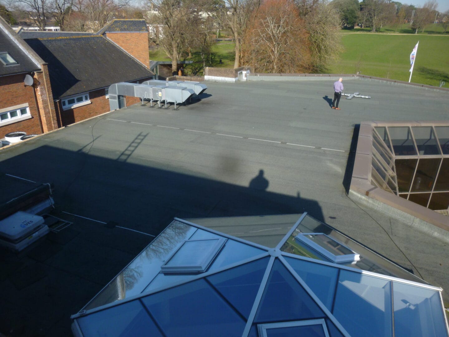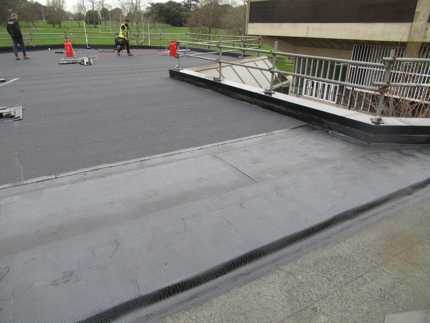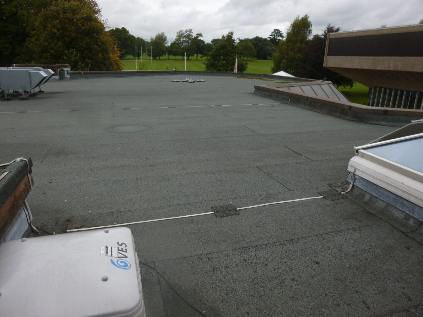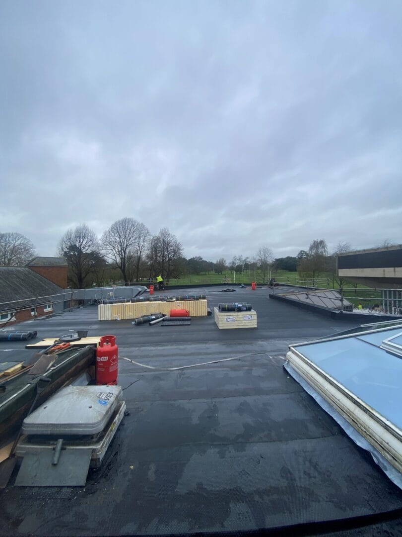 We had to remove 300m2 of the existing felt covering and 150m2 of wet damaged insulation, this was replaced with 130mm thick Kingspan rigid insulation board a metal lined vapour barrier and covered over with a two layer torch on felt system with an mineral surface finish to protect from harmful UV light.