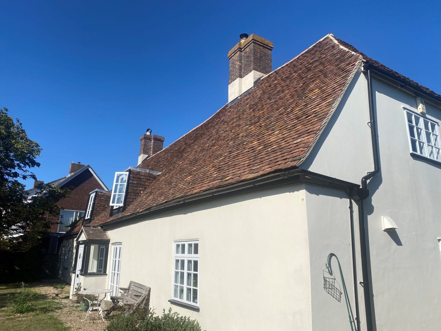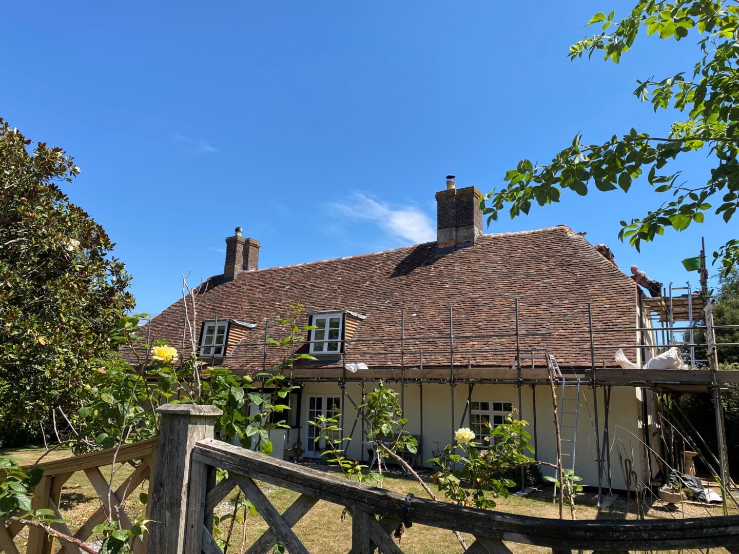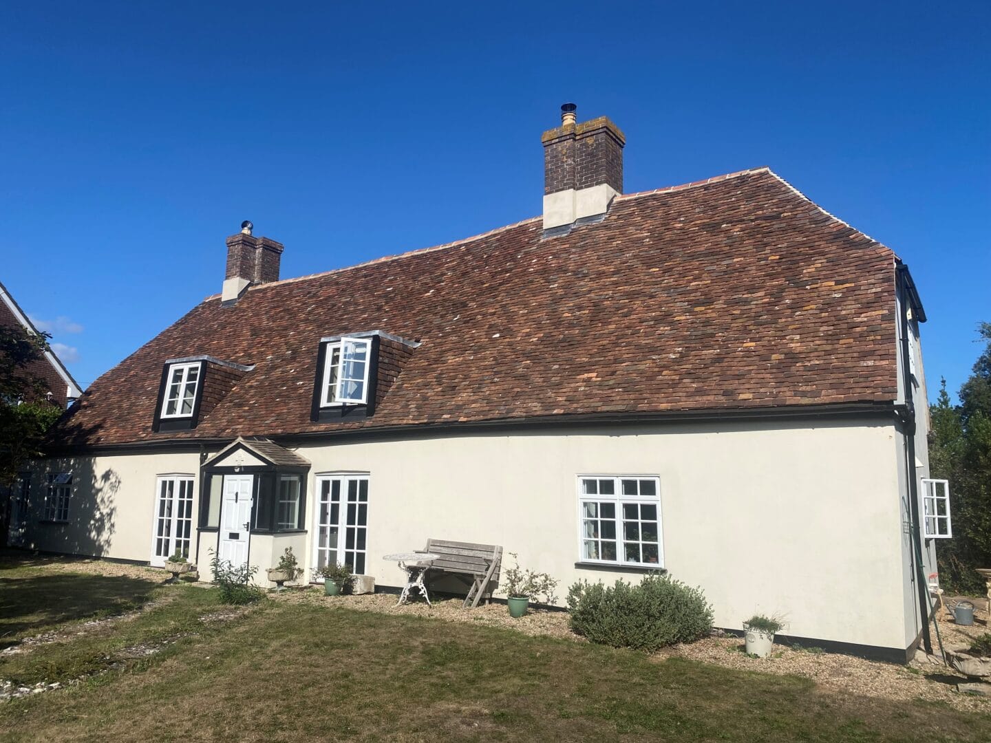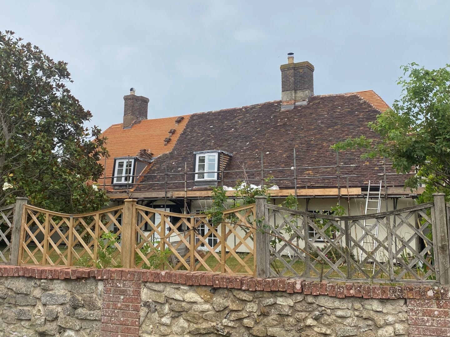 This is a grade II listed cottage in North Hayling Island that the customer instructed us to remove all the existing tiles and re-use what was salvageable, including the full replacement of all the existing felt and battens, also we had to use a bat friendly tile felt and introduce bat tiles to allow bats to enter the roof space as part of the Bat Activity Survey Report. We had to obtain over six thousand reclaimed clay peg tiles from a local reclaim yard and blend them back into the roof with the existing removed tiles. A 50mm Celotex insulation board was inserted between the rafters to help reduce heat loss and gain, we were restricted in the thickness of insulation due to grade II listing requirements. New lead flashings and soakers were fitting to the chimneys and dormers.
