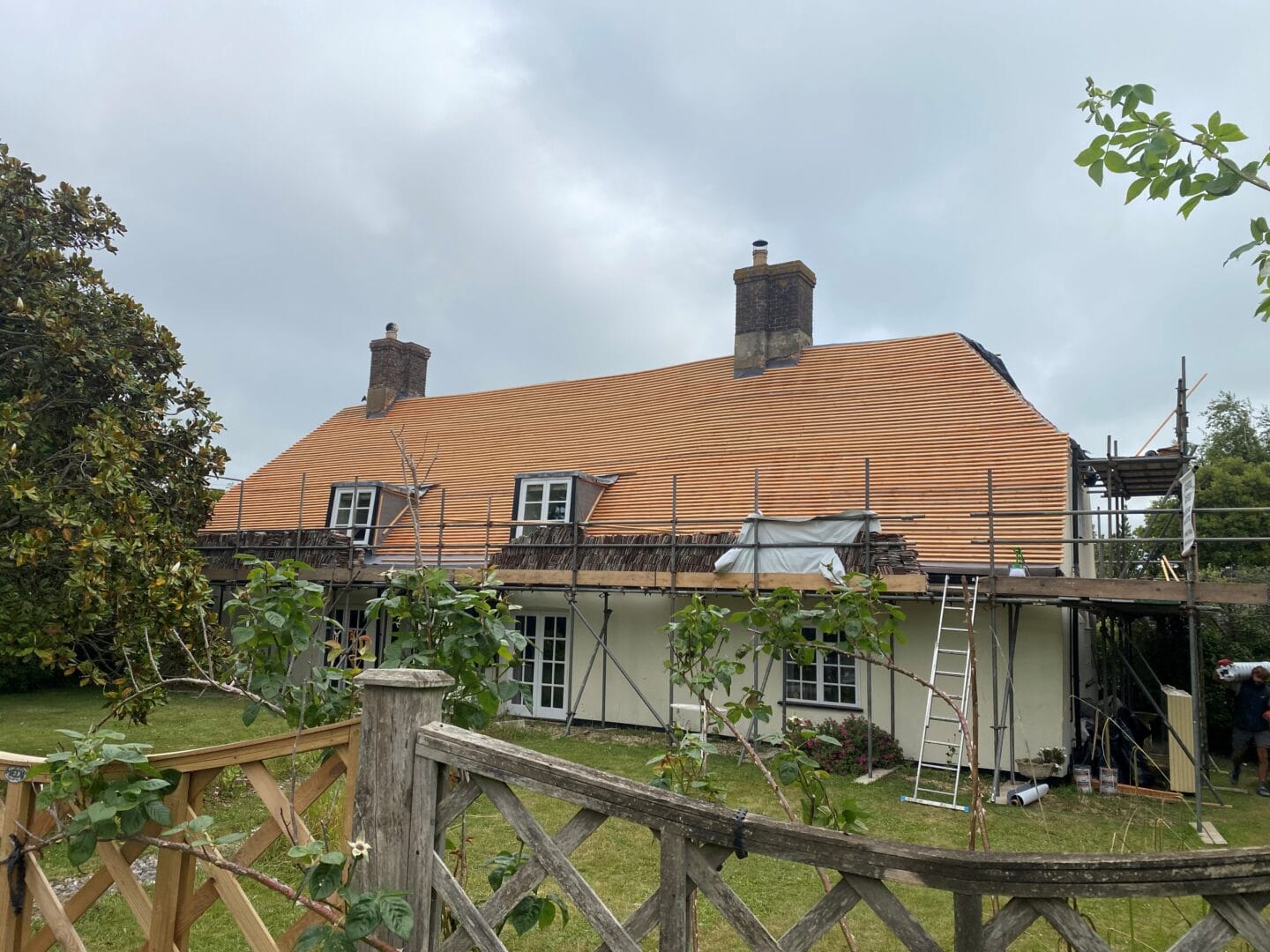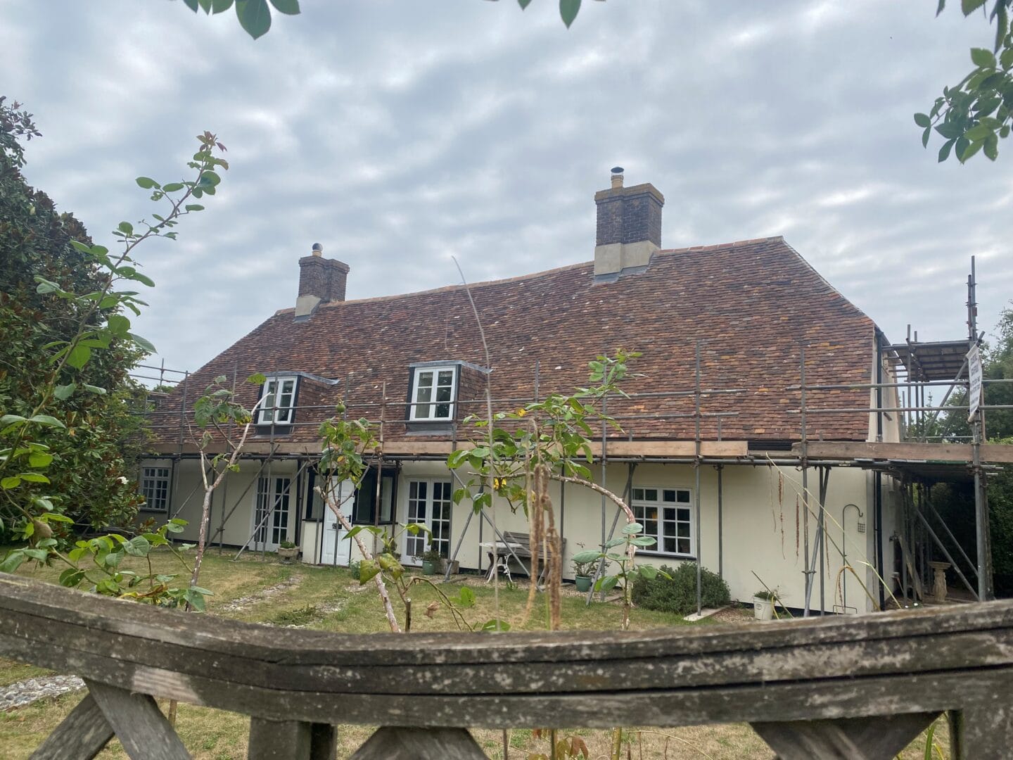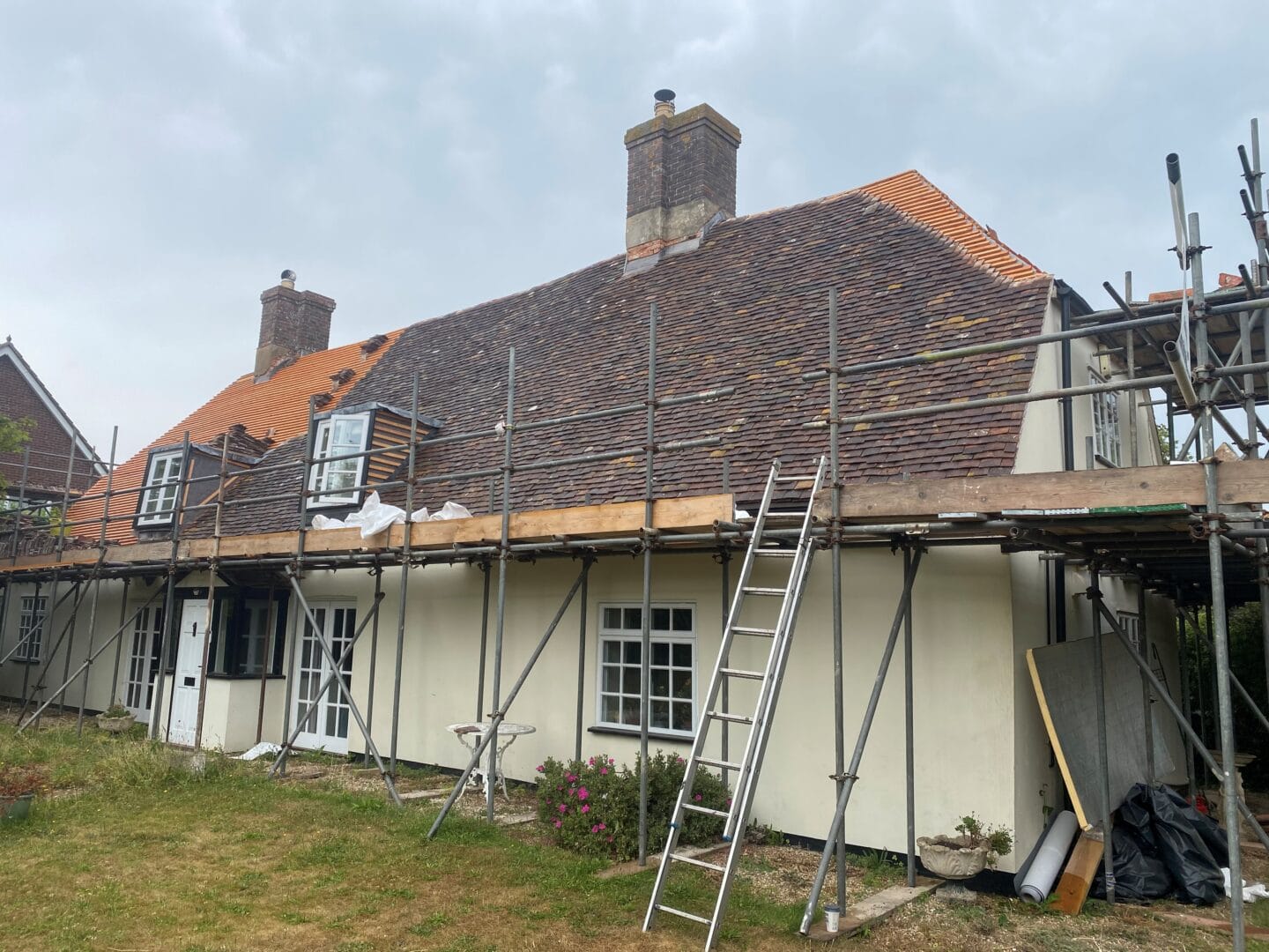 This is a grade II listed cottage in North Hayling Island that the customer instructed us to remove all the existing tiles and re-use what was salvageable, including the full replacement of all the existing felt and battens, also we had to use a bat friendly tile felt and introduce bat tiles to allow bats to enter the roof space as part of the Bat Activity Survey Report. We had to obtain over six thousand reclaimed clay peg tiles from a local reclaim yard and blend them back into the roof with the existing removed tiles. A 50mm Celotex insulation board was inserted between the rafters to help reduce heat loss and gain, we were restricted in the thickness of insulation due to grade II listing requirements. New lead flashings and soakers were fitting to the chimneys and dormers.
