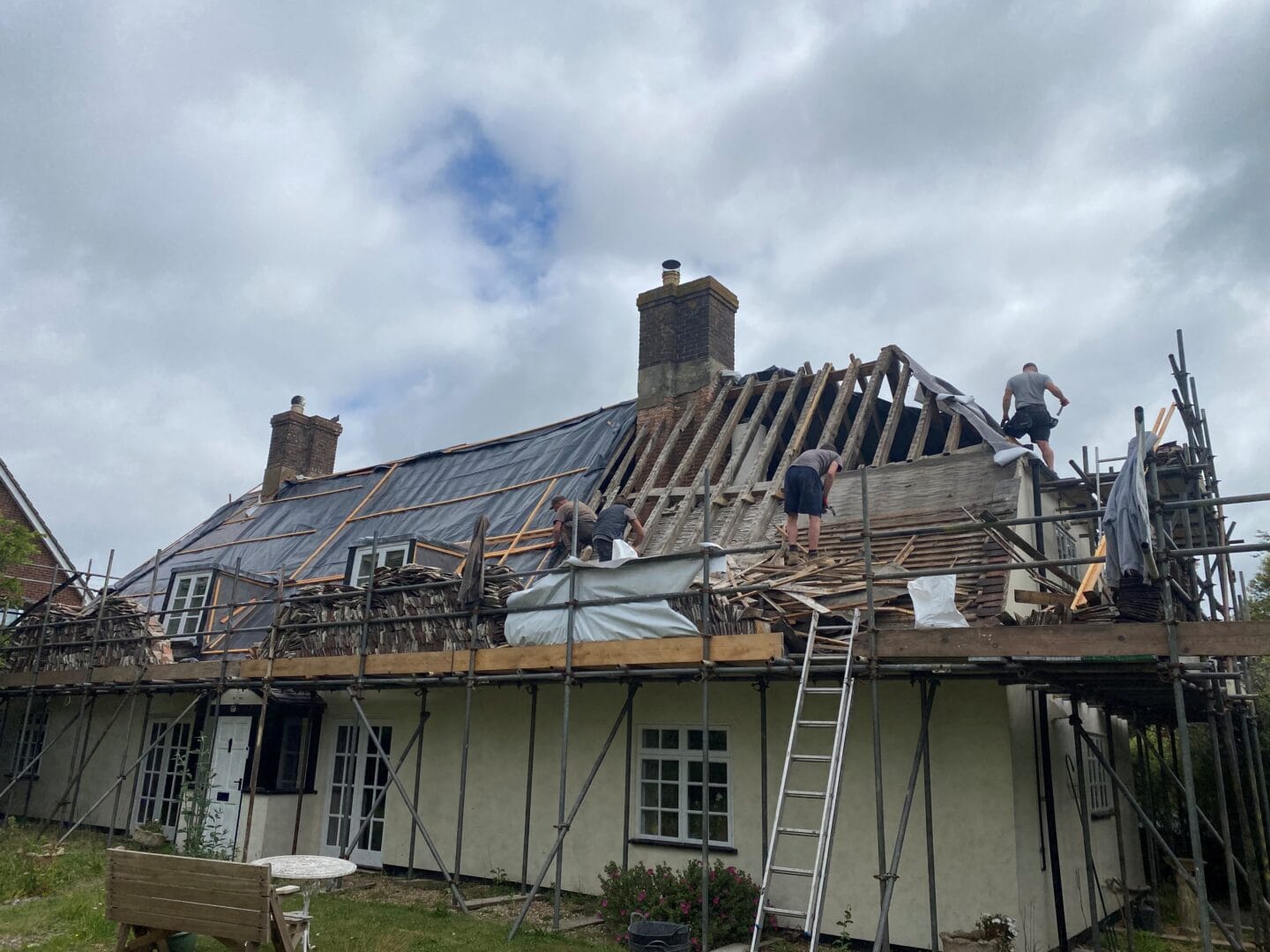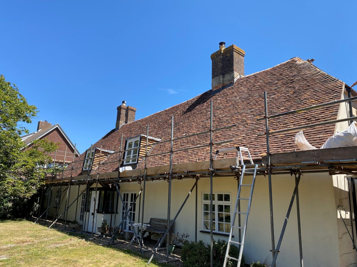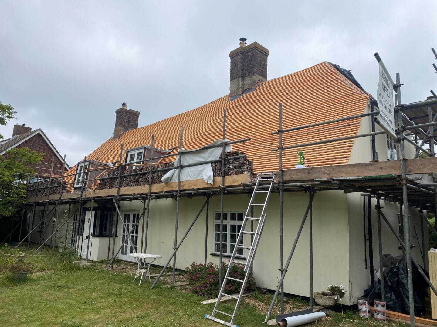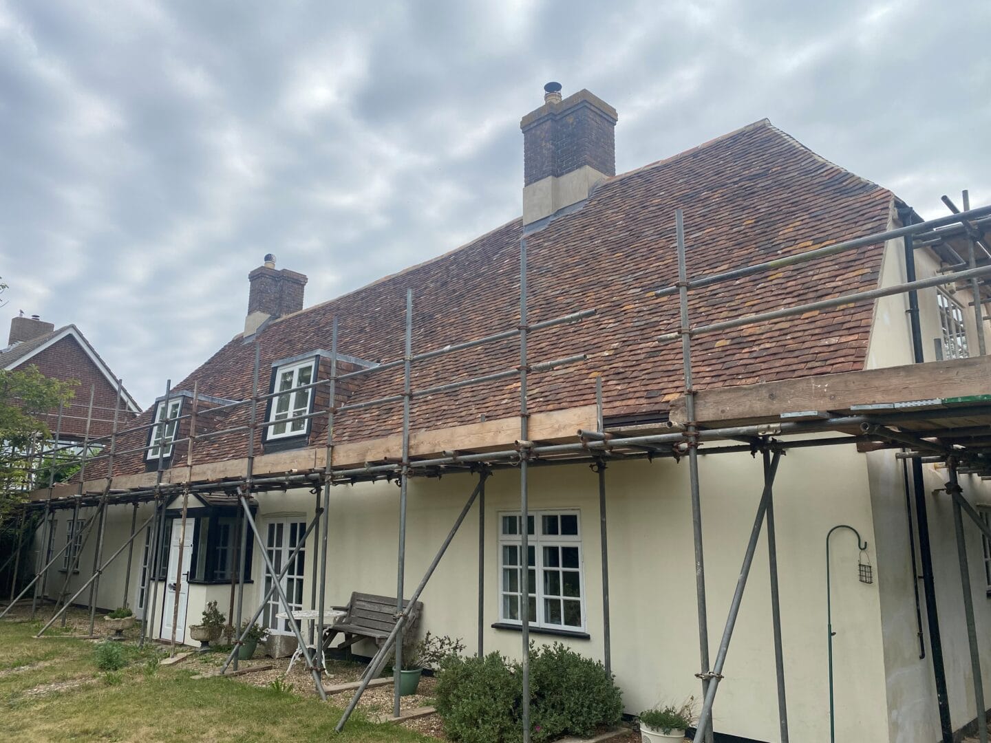 This is a grade II listed cottage in North Hayling Island that the customer instructed us to remove all the existing tiles and re-use what was salvageable, including the full replacement of all the existing felt and battens, also we had to use a bat friendly tile felt and introduce bat tiles to allow bats to enter the roof space as part of the Bat Activity Survey Report. We had to obtain over six thousand reclaimed clay peg tiles from a local reclaim yard and blend them back into the roof with the existing removed tiles. A 50mm Celotex insulation board was inserted between the rafters to help reduce heat loss and gain, we were restricted in the thickness of insulation due to grade II listing requirements. New lead flashings and soakers were fitting to the chimneys and dormers.